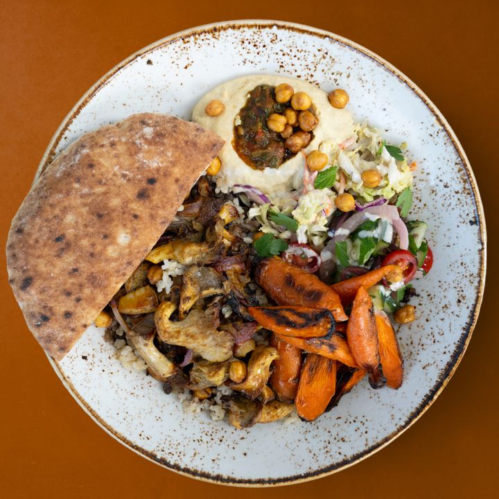 Mushroom shawarma, hummus, black lentils & brown rice, roasted carrots, mediterranean salad, tahini slaw, crispy chickpeas and fresh herbs with harissa zhoug & lemon tahini sauces, served with whole grain pita