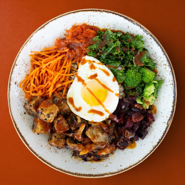 Crispy sesame tofu, chili garlic mushrooms, broccoli, beets, carrots, kale, kimchi, brown rice & quinoa, sesame ginger and garlic gochujang sauces, topped with a fried egg