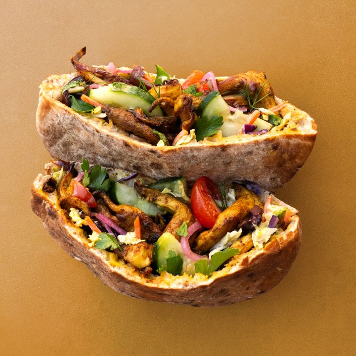 Roasted mushroom shawarma with hummus, tahini slaw, mediterranean salad, fresh herbs, harissa zhoug & lemon tahini sauces in a whole grain pita