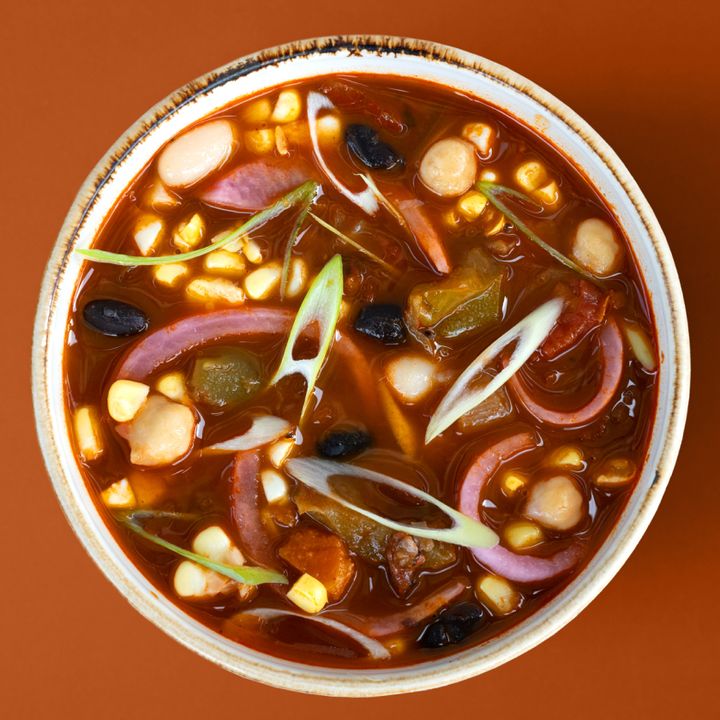 Smoky chipotle chili with chickpeas, black beans, cannellini beans, green & red peppers topped with sweet corn, pickled onion and scallions