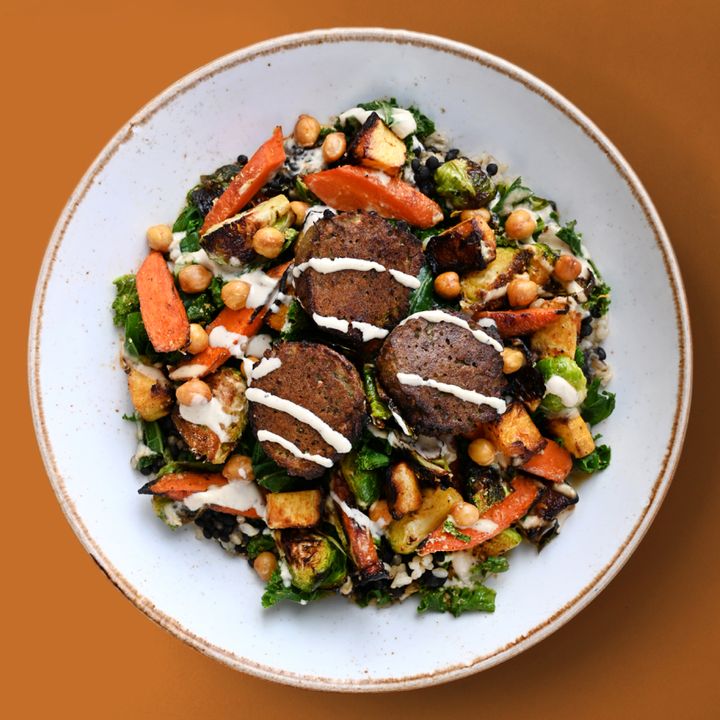Crispy baked falafel, roasted butternut squash, brussels sprouts & carrots, kale, crispy chickpeas, black lentils & brown rice with lemon tahini